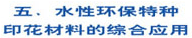 1、白色部位—环保无甲醛拔染浆(Free Formaldehyde Discharging Binder)NF-W(拔白)NF-M(彩拔) 2、咖啡色部位—哑光PU厚版浆(PU Mat Thickening Binder) NPU-M(彩)NPU-W(白) 3、蓝色部位—高级全哑胶浆(True Mat Binder)MD-M(彩)MD-W(白) 4、紫色部位—水性硅胶 (Water-base Silica Binder)SPA-B(透明)SPA-W(白色) 5、桔黄色部位—水性石纹浆(Water-base Stone Line Binder)AST-B AST-W 6、红色部位—拔染风格水浆(Discharging Style Binder)BF-W BF-M BF-2W(特白) 7、绿色—夜光浆(Luminous Binder)GT-35B 总之,水性环保特种印花材料已成为目前纺织品特种印花的主流,要更好地发挥水性环保特种印花材料的作用,既要有科学的原则,还要不断地研究、开发,特别要注意产品应用方面的研究,那样,水性环保特种印花材料将会有广阔的前景。