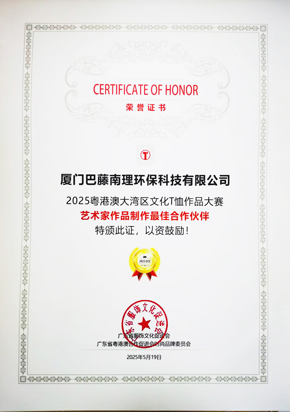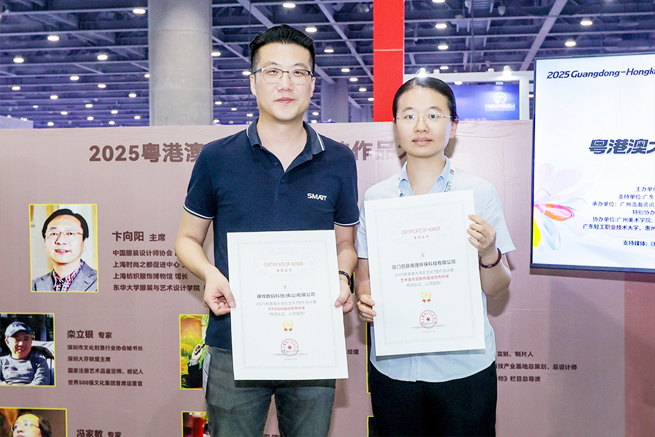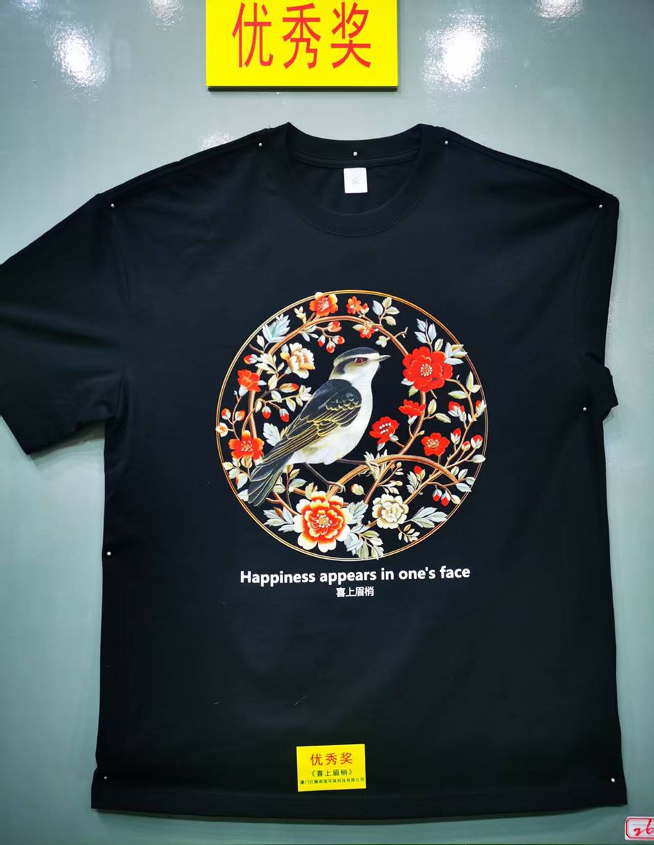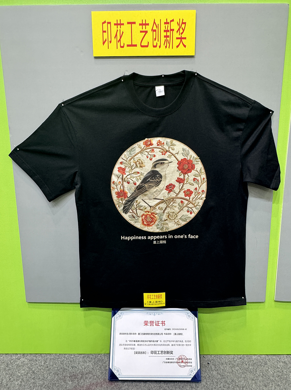 厦门巴藤南理环保科技有限公司印的作品《喜上眉梢》获得“印花工艺创新奖”和“优秀奖”;同时我司又被评为“2025粤港澳大湾区文化T恤作品大赛艺术家作品制作最佳合作伙伴”。